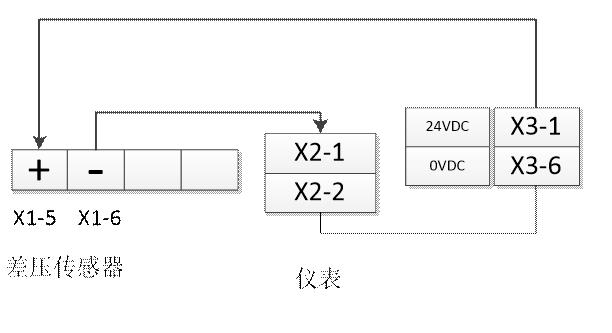 具體的接線(xiàn):將X3接線(xiàn)端子排上的“24V+”接到X1差壓變送器的“+”,差壓變送器的“-”接到X2儀表信號(hào)采集端子“+”,信號(hào)采集端子“-”接到“24V-”端。