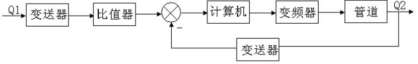 本實(shí)驗(yàn)采用計(jì)算機(jī)控制。調(diào)節(jié)比值器將其支路的流量作為設(shè)定值,計(jì)算機(jī)根據(jù)流量設(shè)定值和P、I、D參數(shù)進(jìn)行PID運(yùn)算,輸出信號(hào)給變頻器,然后由變頻器控制變頻器供水系統(tǒng)的進(jìn)水流量,從而達(dá)到控制流量比例恒定的目的。