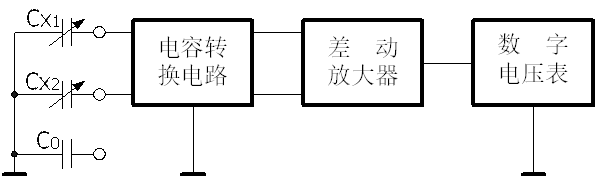 實驗電路框圖如圖8-1所示。與實驗七不同之處在于接入電容轉(zhuǎn)換電路的兩個電容都為可變電容,當(dāng)電容傳感器的動極移動時,兩個電容的電容量都發(fā)生變化,但變化方向相反,這樣就構(gòu)成差動式的電容傳感器。