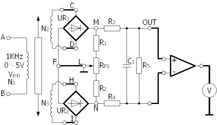 傳感器的兩個次級線圈(N2、N3)電壓分別經(jīng)UR1、UR2兩組橋式整流電路變換為直流電壓,然后相減,經(jīng)過差動放大器放大后,由電壓表顯示出來。R1、R2為兩橋臂電阻,RP1為調(diào)零電位器,R3、R4、C1組成濾波電路,R5為負載電阻,采用這種差動整流電路可以減少零點殘余電壓。