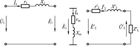 1.相關(guān)知識(shí) 1)負(fù)載運(yùn)行時(shí)的物理情況 2)負(fù)載運(yùn)行時(shí)的電磁關(guān)系 (1)磁動(dòng)勢(shì)平衡方程式 空載時(shí)的主磁通 這一關(guān)系式稱為磁動(dòng)勢(shì)平衡方程式。 式(3-18)兩邊同除以N1并移相,得: 由式(3-19)可知,當(dāng)負(fù)載電流增大時(shí), (2)電壓平衡方程式 3)負(fù)載運(yùn)行時(shí)的等效電路 (1)繞組的折 (2)“T”形等效電路 經(jīng)過折算繞組,可得變壓器的部分等效電路,如圖3-16(a)所示。其中一、二次側(cè)之間的耦合作用,由主磁通在繞組中產(chǎn)生的感應(yīng)電動(dòng)勢(shì) ![]() (a)部分等效電路 ![]() (b)“T”形等效電路 圖3-16 變壓器的“T”形等效電路的形成過程 (3)近似和簡(jiǎn)化等效電路 |