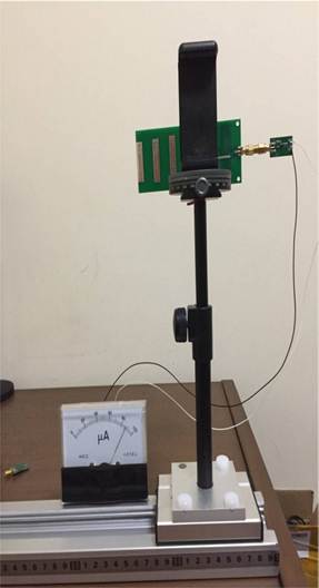 天線的方向圖,測試系統(tǒng)框圖如下圖2所示。輔助天線作發(fā)射,由功率信號發(fā)生器激勵產生電磁波;被測天線作接收,被測天線置于可以水平旋轉的實驗支架上,接收到的高頻信號經檢波后送給電流指示器顯示。