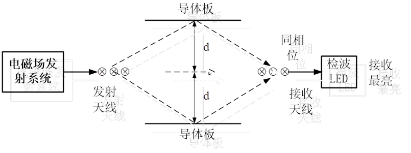 當用直射線和兩條反射線疊加相位相等時LED最亮,相位相反時,接收電磁波抵消LED不亮。移動距離中軸線的距離d,接收LED時滅時亮,某一個位置時達到最亮。記錄下距離中軸線的距離d,計算直射線和反射線的距離差值。反射線經(jīng)過導體板反射時有180度的相位差。