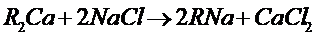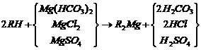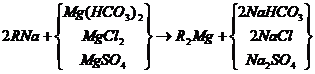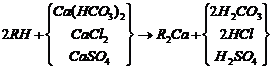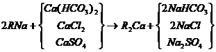 當含有鈣鹽及鎂鹽的水通過裝有陽離子交換樹脂的交換器時,水中的Ca2+及Mg2+便與樹脂中的可交換離子(Na+或H+)交換,使水中Ca2+、 Mg2+含量降低或基本上全部去除,這個過程叫做水的軟化。樹脂失效后要進行再生,即把樹脂上吸附的鈣、鎂離子置換出來,代之以新的可交換離子。鈉離子交換用食鹽(NaCl)再生、氫離子交換用鹽酸(HCl)或硫酸(H2SO4)再生;痉磻(yīng)式如下。
