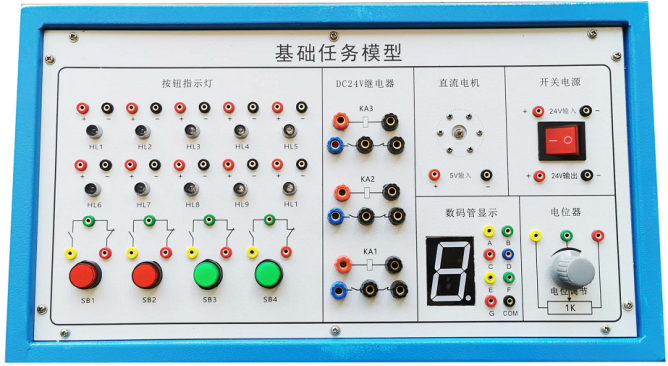 該任務(wù)盒有1.2mm優(yōu)質(zhì)鋼板加工噴涂制作,面板有鋁板加工沖孔而成,表面貼膜制作,配置有直流電機(jī)、7段數(shù)碼管、彩燈組、繼電器組、按鈕組、電位器等,能滿(mǎn)足對(duì)PLC教學(xué)基礎(chǔ)任務(wù)指令的學(xué)習(xí)與應(yīng)用。