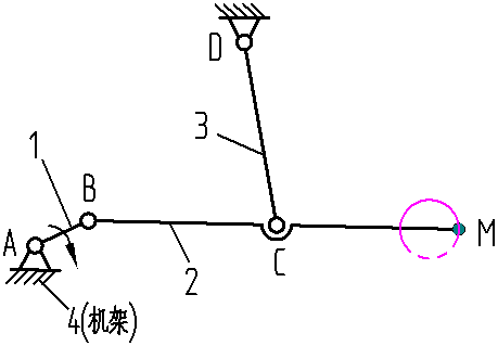 構(gòu)件1繞A點(diǎn)順時(shí)針方向轉(zhuǎn)動(dòng)時(shí),構(gòu)件2上M點(diǎn)以逆時(shí)針方向轉(zhuǎn)動(dòng),其軌跡為近似圓形。