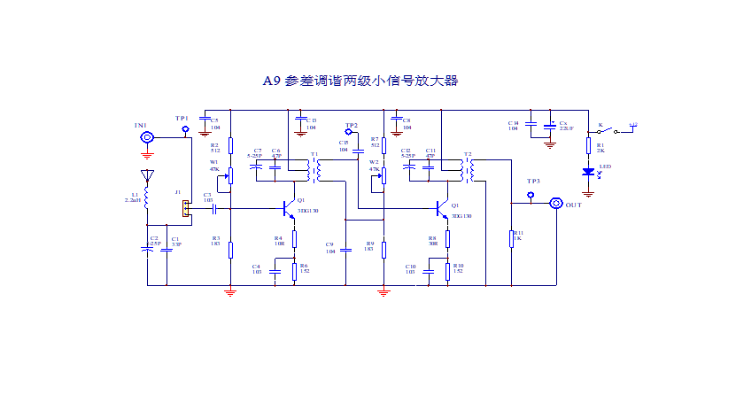 注意:當(dāng)兩級放大器的中心頻率完全一致時,若各級增益過大極易產(chǎn)生高頻自激,因此,當(dāng)發(fā)現(xiàn)電路有自激傾向時,可適當(dāng)調(diào)整W1和W2降低工作點電流以略微降低各級增益,或?qū)杉壵{(diào)諧放大器的微調(diào)電容進行相反大小的微調(diào),預(yù)置為參差調(diào)諧模式,均可有效消除自激傾向。