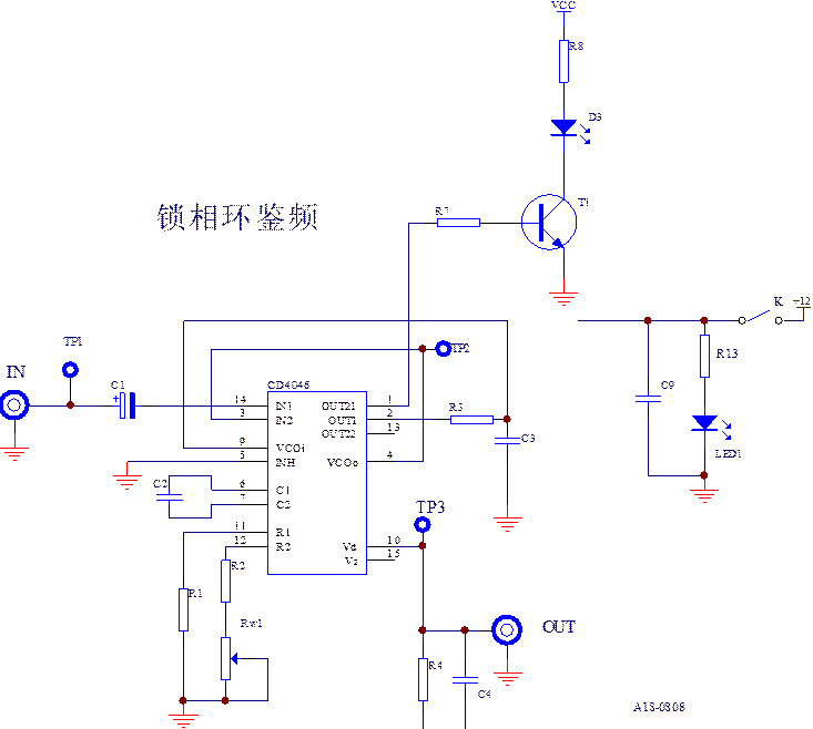 采用CD4046鎖相環(huán)集成芯片來實(shí)現(xiàn)鑒頻,其鑒頻實(shí)際電路如圖11-4所示。