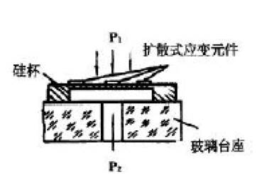丈量敏感元件為周邊固支的硅杯,在此杯單晶硅膜片的上下兩側(cè)出現(xiàn)壓差時(shí)膜片內(nèi)部孕育發(fā)生應(yīng)力。在壓力P1、P2 作用下電橋出現(xiàn)不均衡,輸出一個(gè)正比于壓力變革的電壓信號(hào)。