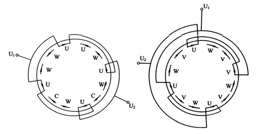 · 極相組的連接。在一個極下的,屬于同一相的所有線圈串聯(lián)在一起,稱為一個極相組。為了保證三相電動機線圈連接之后,能形成 N 極和 S 極相間的排列,各極相組之間的連接,必須是頭頭相拉,如圖 5-1(a)所示。但也有如圖 5-1(b)所示的頭尾相接,這時可以看到,同樣是四極三相電動機,它只有兩個極相組,因而它必須是頭尾相接,才能形成四極的磁場,但此種接法通常用于單繞組多速三相電動機。在中小型電動機中,一個極相組內(nèi)的線圈一般是連續(xù)繞制的,因此不用接頭。(a)頭頭和尾尾相接 (b)頭尾相接