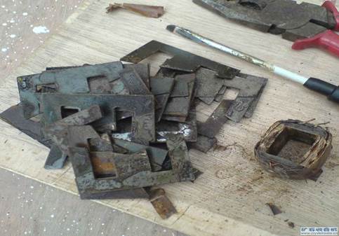 5、 接下來用起子慢慢連敲帶撬,讓那一兩片鐵心加大位移,直到從線包中完全脫離出來。如圖1-6。