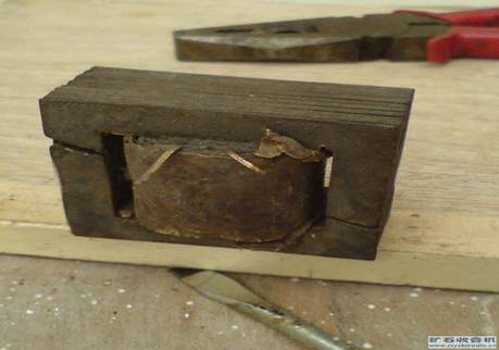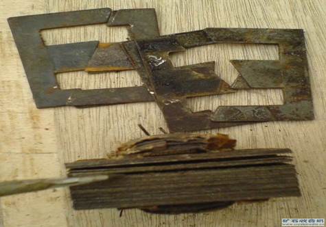 6、把對(duì)側(cè)的那兩片也敲出來,這下鐵心就沒有那么緊了,重復(fù)上面的步驟,再敲出一兩片來,就不會(huì)很困難了。如圖1-7。