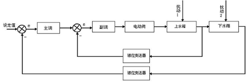 本實(shí)驗(yàn)采用儀表控制,將上水箱液位控制在設(shè)定高度。串級(jí)回路是由內(nèi)反饋組成的雙環(huán)控制系統(tǒng),屬于復(fù)雜控制范疇。根據(jù)下水箱的液位信號(hào)輸出給儀表,作為主調(diào)節(jié)器輸入,主調(diào)節(jié)器的輸出作為副調(diào)節(jié)器的輸入,在串級(jí)控制系統(tǒng)中,兩個(gè)調(diào)節(jié)器任務(wù)不同,因此要選擇調(diào)節(jié)器的不同調(diào)節(jié)規(guī)律進(jìn)行控制,副調(diào)節(jié)器主要任務(wù)是快速動(dòng)作,迅速抵制進(jìn)入副回路的擾動(dòng),至于副回路的調(diào)節(jié)不要求一定是無(wú)靜差。主調(diào)節(jié)器的任務(wù)是準(zhǔn)確保持下水箱液位在設(shè)定值,因此,主調(diào)節(jié)器采用PI調(diào)節(jié)器也可考慮采用PID調(diào)節(jié)器。上下水箱雙容串級(jí)控制方塊原理圖如下: