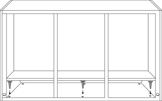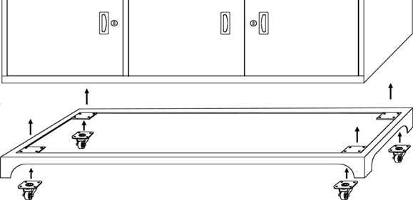 ② 將桌體翻轉(zhuǎn),圍板與萬(wàn)向輪一同安裝到實(shí)驗(yàn)臺(tái)桌身,注意孔位對(duì)齊。按照右圖所示