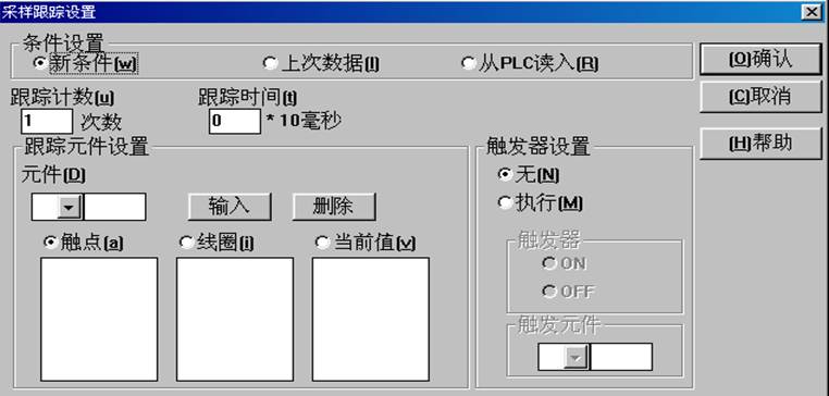 (3)采樣跟蹤 采樣跟蹤的目的在于存儲與時間相關(guān)的元件數(shù)值變化,并將其時間表中加以顯示;或在PLC中設(shè)置采樣條件,顯示基于PLC采樣數(shù)據(jù)的時間表。操作方法是執(zhí)行[PLC]-[采樣跟蹤]-[參數(shù)設(shè)置]菜單,如圖2-14所示;并在顯示的對話框中設(shè)置各項條件,如圖2-15所示,再執(zhí)行[運行]、[顯示]、[從記錄文件中讀入]、[寫入記錄文件]菜單命令即可。