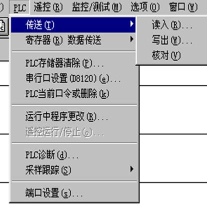 (1)程序傳送 將已創(chuàng)建的順控程序成批傳送到PLC中。傳送功能包括讀入、寫出以及校驗,操作方法由執(zhí)行[PLC]-[傳送]-[讀入]、[寫出]、[校驗]菜單操作完成,如圖2-11所示。當(dāng)選擇[讀入]時,應(yīng)在[PLC類型設(shè)置]對話框中將已連接的PLC類型設(shè)置好,其操作窗口如圖2-12所示。