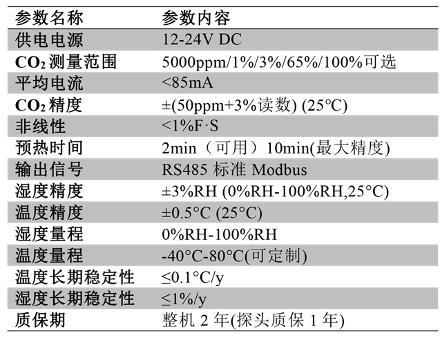 表2-2 二氧化碳傳感器探頭參數(shù)與選型