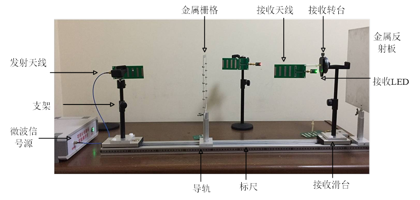 實(shí)驗(yàn)平臺(tái)設(shè)有波長測量、功率檢波、電磁場極化等若干簡單又富有論證性的實(shí)驗(yàn)。將實(shí)驗(yàn)儀器的功率發(fā)射端加載到三種極化天線端口。將天線采集到的感生電流接入LED燈。把檢波天線放置在固定的位置以后,可以看到LED燈的明暗與極化方式有著對應(yīng)的關(guān)系。將發(fā)射天線的功率輸入天線,通過調(diào)整檢波天線的位置或者檢波天線的角度方向,觀察發(fā)光燈的明暗變化。這樣就可以直觀的感受到電磁波的分布參數(shù)、極化等豐富的概念。在整個(gè)實(shí)驗(yàn)過程中,通過極其簡單的幾個(gè)操作,就可以將所學(xué)的抽象的知識(shí),通過具象化的實(shí)驗(yàn)來驗(yàn)證清楚,進(jìn)一步提高了教學(xué)的效率。增加了學(xué)生對實(shí)驗(yàn)的印象,提高了學(xué)生動(dòng)手能力,深刻的將公式與現(xiàn)象結(jié)合起來,為以后的工作和學(xué)習(xí)提供了切實(shí)有效的經(jīng)驗(yàn)。提升學(xué)生對電磁場與波的學(xué)習(xí)興趣,實(shí)現(xiàn)探究性學(xué)習(xí),創(chuàng)造性學(xué)習(xí)。