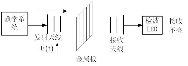 3)將垂直縫隙柵格平面金屬板放入收發(fā)天線中間,觀察LED燈是否被點(diǎn)亮。按下發(fā)射開關(guān),此時(shí)電磁波發(fā)射出來,觀察LED燈是否被點(diǎn)亮,因?yàn)椴粷M足邊界條件LED燈不亮。