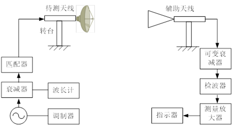 天線的方向圖,測試系統(tǒng)框圖如下圖2所示。輔助天線作發(fā)射,由功率信號發(fā)生器激勵產生電磁波;被測天線作接收,被測天線置于可以水平旋轉的實驗支架上,接收到的高頻信號經檢波后送給電流指示器顯示。