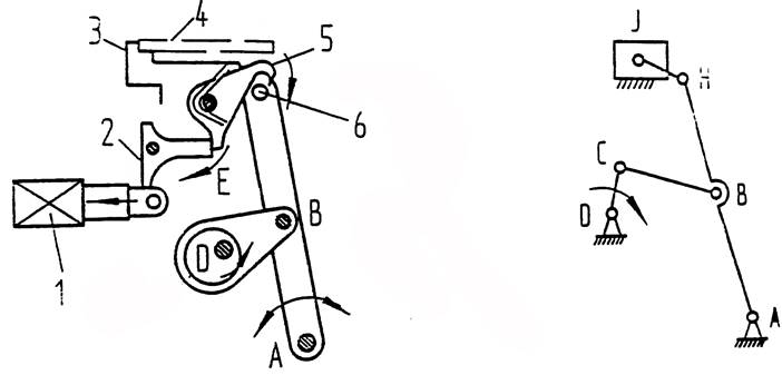 機(jī)構(gòu)說明:圖1-1所示為卡片穿孔機(jī)的送卡片機(jī)構(gòu),圖1-2是其送卡片時(shí)的機(jī)構(gòu)運(yùn)動(dòng)簡(jiǎn)圖。根據(jù)螺線管1的輸入信號(hào),向左拉動(dòng)棘爪2時(shí),E部松開,棘爪5落下卡住軸6組成轉(zhuǎn)動(dòng)副。于是,偏心軸的運(yùn)動(dòng)得以傳遞給滑座3,將卡片4送出。偏心軸一直不動(dòng),只有當(dāng)軸6被棘爪鉤住時(shí),才能移送卡片。