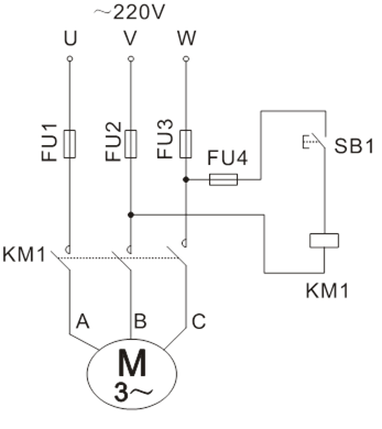 按下控制屏上“停止”按鈕切斷三相交流電源后,按圖5-8接線,圖中SB1、SB2、SB3、KM1、FR1、FU1、FU2、FU3、FU4為掛件GDQ39-1上的器件,電機選用DQ10(△/220V)。