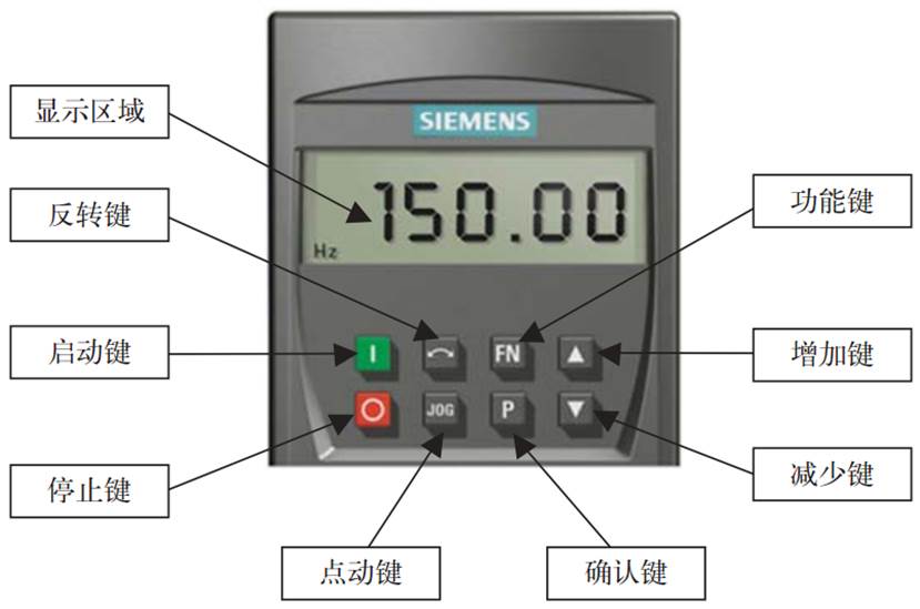 利用變頻器的操作面板和相關(guān)參數(shù)設(shè)置,即可實(shí)現(xiàn)對變頻器的某些基本操作如正反轉(zhuǎn)、點(diǎn)動等運(yùn)行。變頻器面板的介紹及按鍵功能說明如下圖,具體參數(shù)號和相應(yīng)功能參照系統(tǒng)手冊。